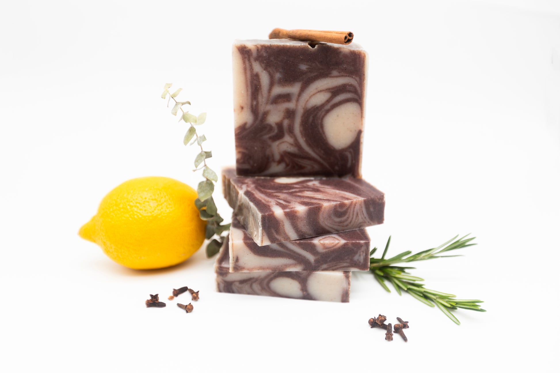 Ingredients: Coconut Oil, RSPO Sustainably Sourced Palm Oil, Olive Oil, Sodium Hydroxide (Lye), Water, Clove Essential Oil, Eucalyptus Essential Oil, Rosemary Essential Oil, Lemon Essential Oil, Ground Cinnamon Powder.