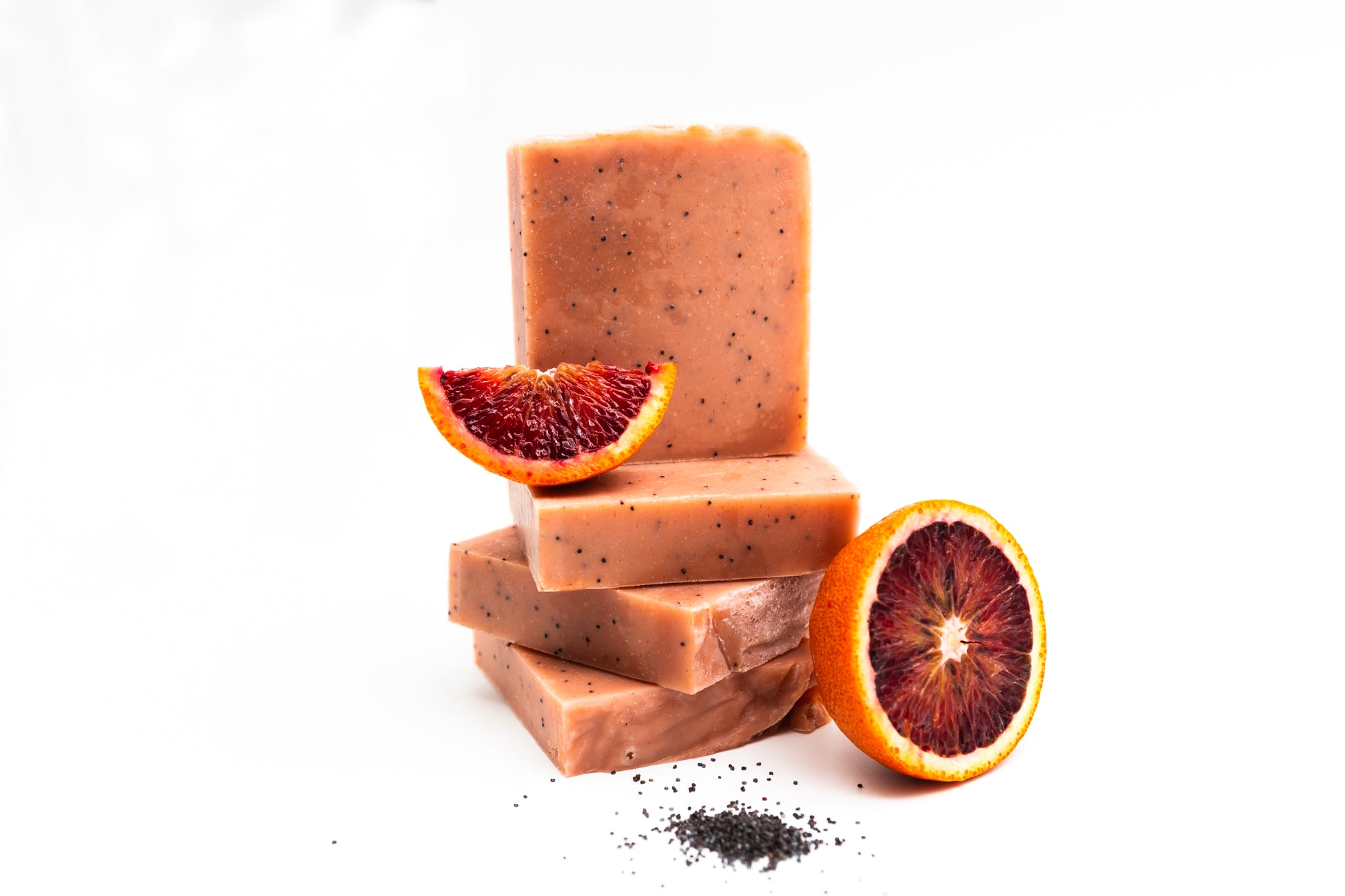 Ingredients: Coconut Oil, RSPO Sustainably Sourced Palm Oil, Olive Oil, Sodium Hydroxide (Lye), Water, Blood Orange Essential Oil, Poppy Seeds, Naturally Occurring Red Iron Oxide, Naturally Occurring Yellow Iron Oxide.